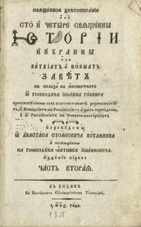 Анотация: Избрани из ветхият и новият завет в полза на юношеството от господина Йоанна Гибнера; Присовокупени сас благочестивите размишления, от немецкият на российският язик переведени, а от российският на славеноболгарският наш язик переведени от Анастаса Стояновича, котлянина; Посвещени на г. Антониа Йоановича